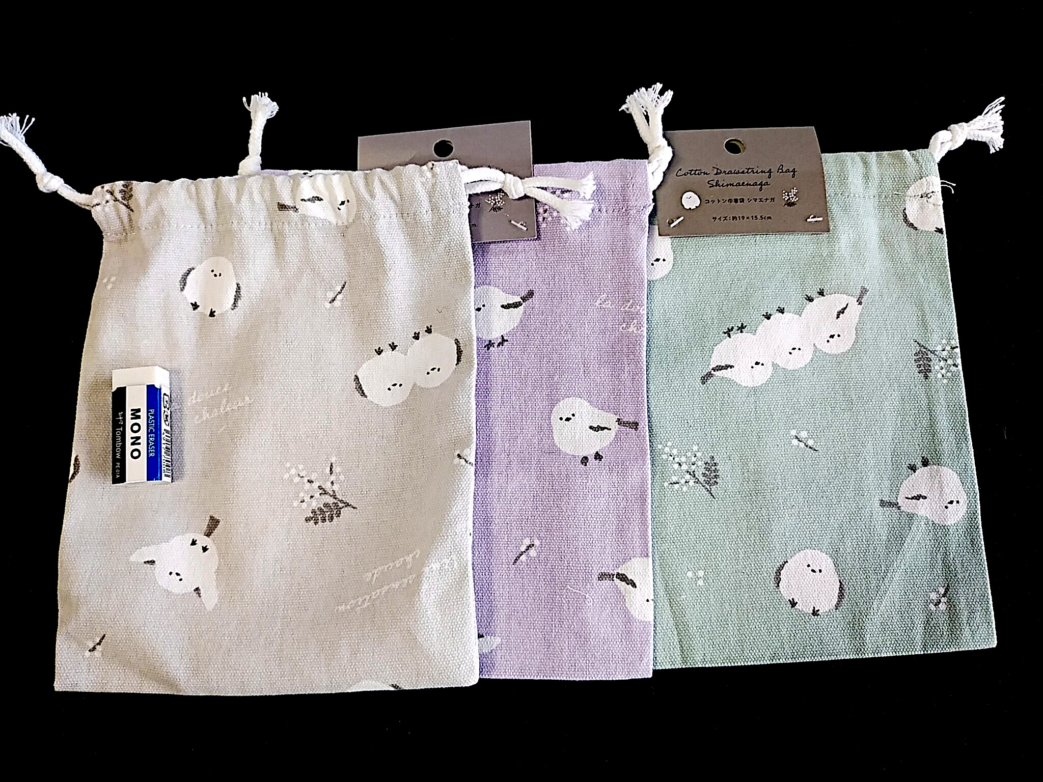 シマエナガの柄が入った巾着袋です。