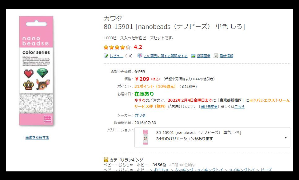 一例ですが、ナノビーズの白はヨドバシで209円です。